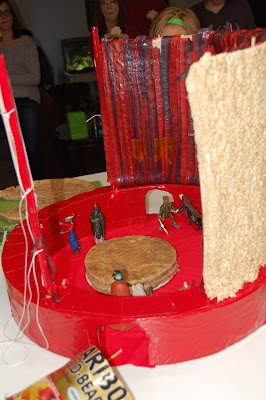 The walls are my favorite large-scale building material: Rice Krispy Treats. I made 4 large (10x14") pans of treats - each containing a double batch of mix. (Use the recipe on the back of the Rice Krispy cereal box.) Let these set overnight to get completely firm, then run bamboo skewers through them and mount them upright on the Styrofoam base as shown. Curve them carefully to create the room. To be safe, I added a backing of heavy paper, and we looped some string around the dowels.